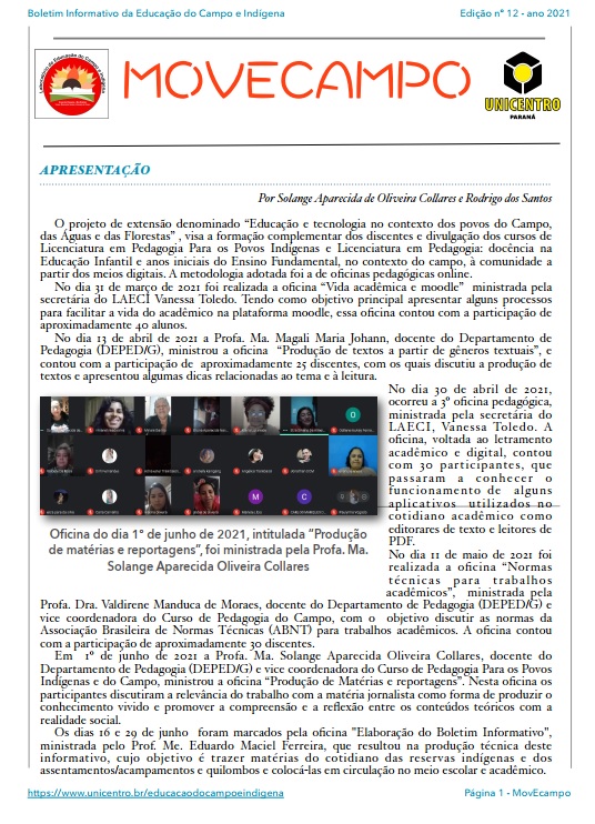 A recente aprovação do Curso de Licenciatura em Pedagogia: docência na Educação Infantil e anos iniciais do Ensino Fundamental no contexto do Campo, da Unicentro em parceria com outras importantes instituições estaduais e nacionais é sem dúvida uma das mais significativas conquistas para nossa universidade e para educação pública. O objetivo é formar 50 educadores oriundos dos acampamentos e assentamentos da Reforma Agrária e de comunidades quilombolas para atuar na educação infantil e nos anos iniciais do ensino fundamental das escolas em seus diferentes contextos.